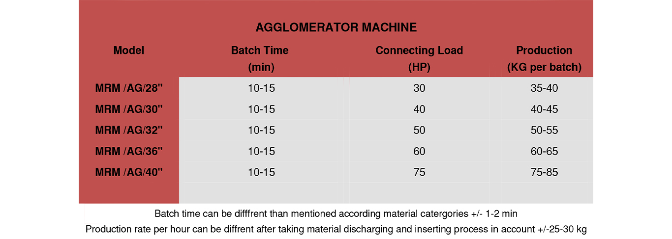 In the entire process, A plastic material, normally in wastage form (film waste) is dropped into agglomerator feeding spot , reach the rotor whilst rotor is in rotating condition. Blades cut the film plastic constantly which creates friction and heat until it reaches the desired size. This process causes material to reach to the softening point. In this stage, operator add some water to create a kind of shock. After water evaporates, material comes out from discharge spot as chips.