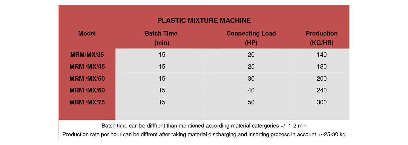 In the entire process, A plastic material, normally in flakes form or granules form is loaded into drum along Master batch, pigment or additive, usually made from fabricated from mild steel inside and out or fabricated from mild steel on outside and stainless steel on inside as per material requirement. There is mild steel / stainless steel rotor fitted on the shaft on center of the drum. Where’s heavy duty bearing housing provided for the shafting of mixture machine. AC motor is connected with shafting with pulleys and belts. Rotor rotates at high RPM. Where raw material and additives starts to mix with each other and due to friction raw material gets warm up around 70-80 degrees. Warmed raw material makes extruder job effortless. Batch size depends on the drum storage capacity of mixture machine where batch timings are around 10-15 min. After cycle completes, finished raw material is discharged from the output mouth of the drum.